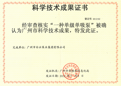 一种单级单吸泵科学技术成果证书