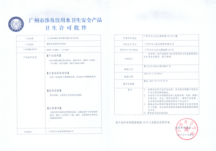 BWG系列罐式叠压给水设备卫生许可证