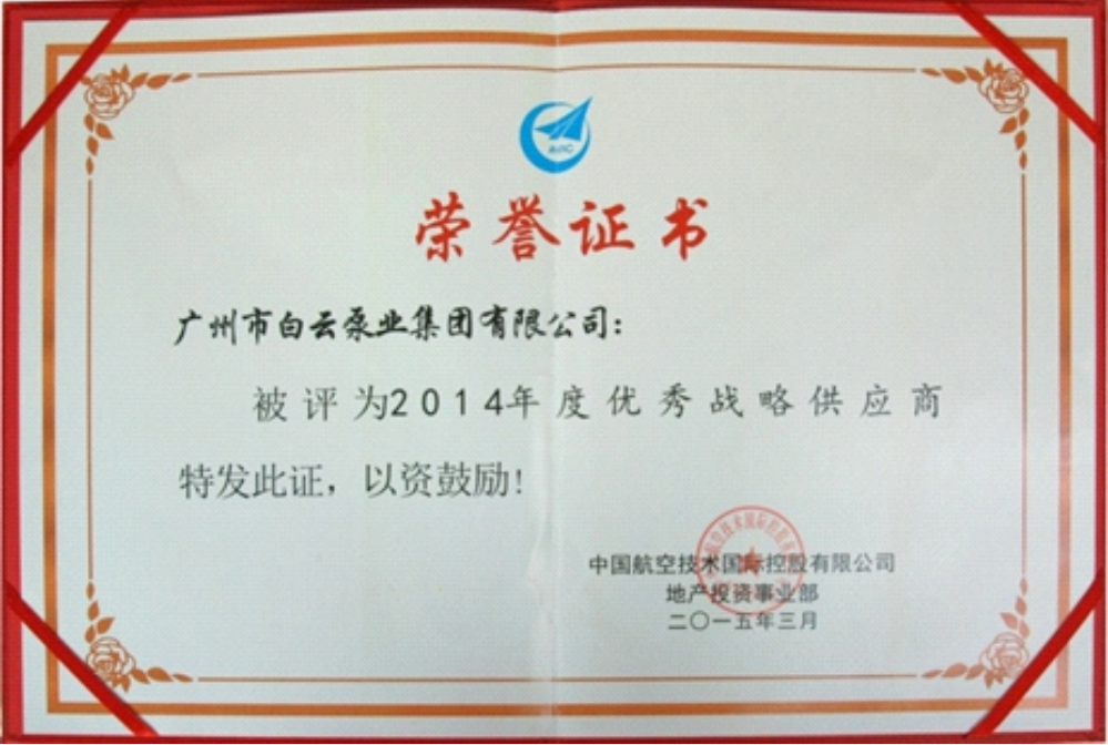 2015年3月23日,中国航空技术国际控股有限公司授予焦点娱乐泵业集团“2014年优秀战略供应商”荣誉证书,我司长期本着“质量是企业生存之本”的质量理念,坚持“客户需求是焦点娱乐 全力以赴的事业”的服务理念,不断向客户提供优质的产品,快捷的服务,此次的荣誉证书是对集团产品和服务的充分肯定,为双方后续更为深入合作奠定坚