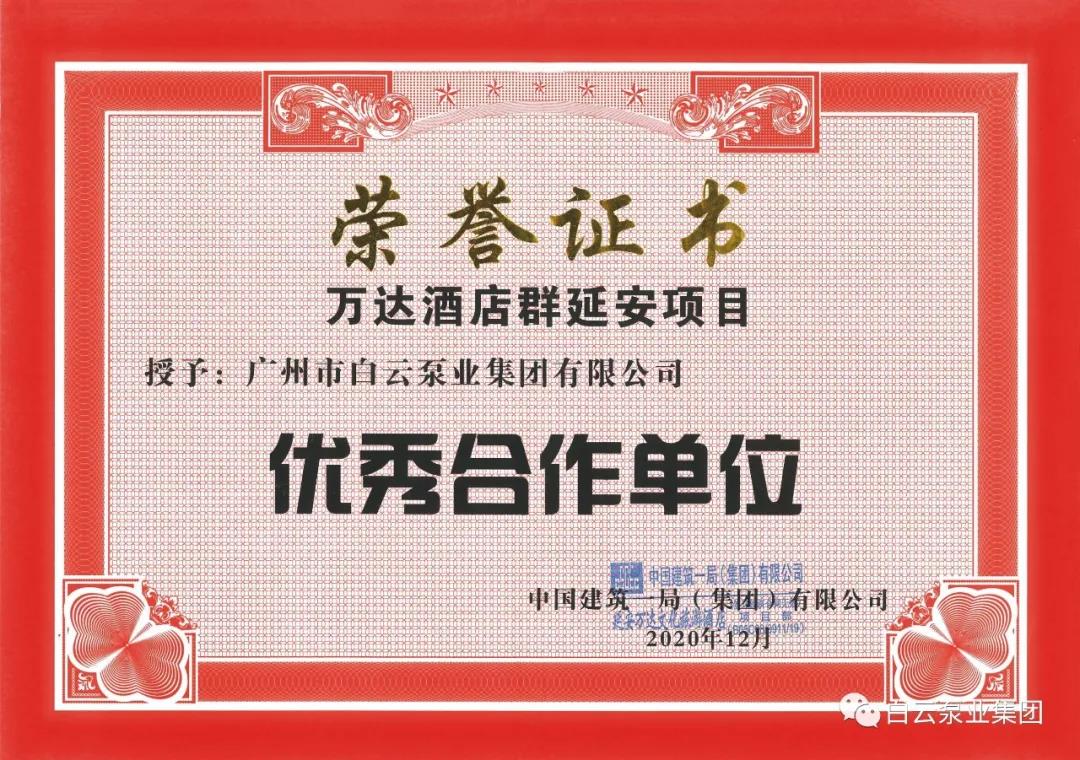 2020年12月,中建一局集团万达酒店群延安项目合作商表彰会在项目部会议室召开,焦点娱乐泵业集团荣获“优秀合作单位”称号。