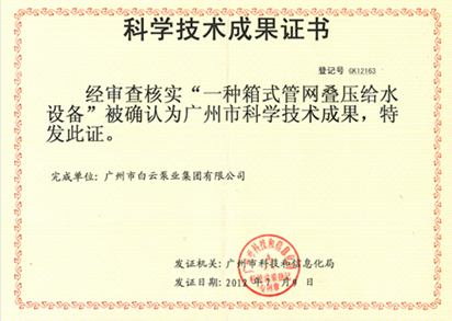 一种箱式管网叠压给水设备科学技术成果证书