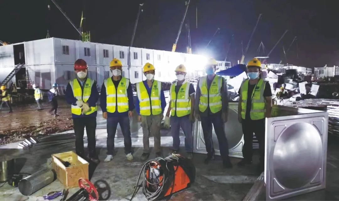 为尽快满足项目供水需求,公司积极克服疫情临时管控,部分岗位员工居家,导致生产人手不足的困难,在岗的160多名生产工人吃住在厂里,宿舍不够就在办公室、会议室里打地铺,加班加点,日夜赶工,确保方舱医院建设项目设备早日交付。