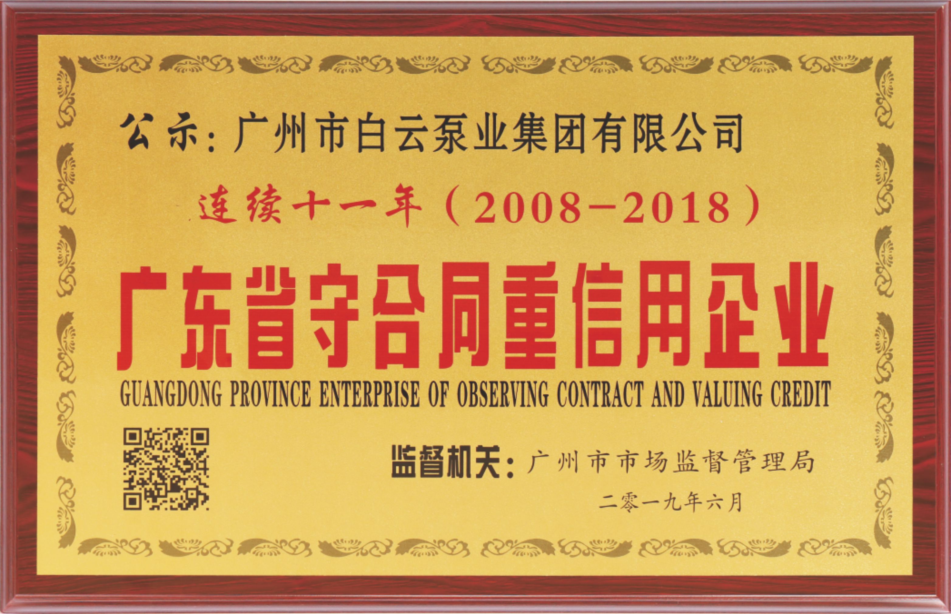 2019年6月,经广东省工商行政管理局审核批准,广州市焦点娱乐泵业集团公司再次获得“广东省守合同重信用企业”荣誉证书,这是公司连续十一年(2008年-2018年)获得该荣誉。